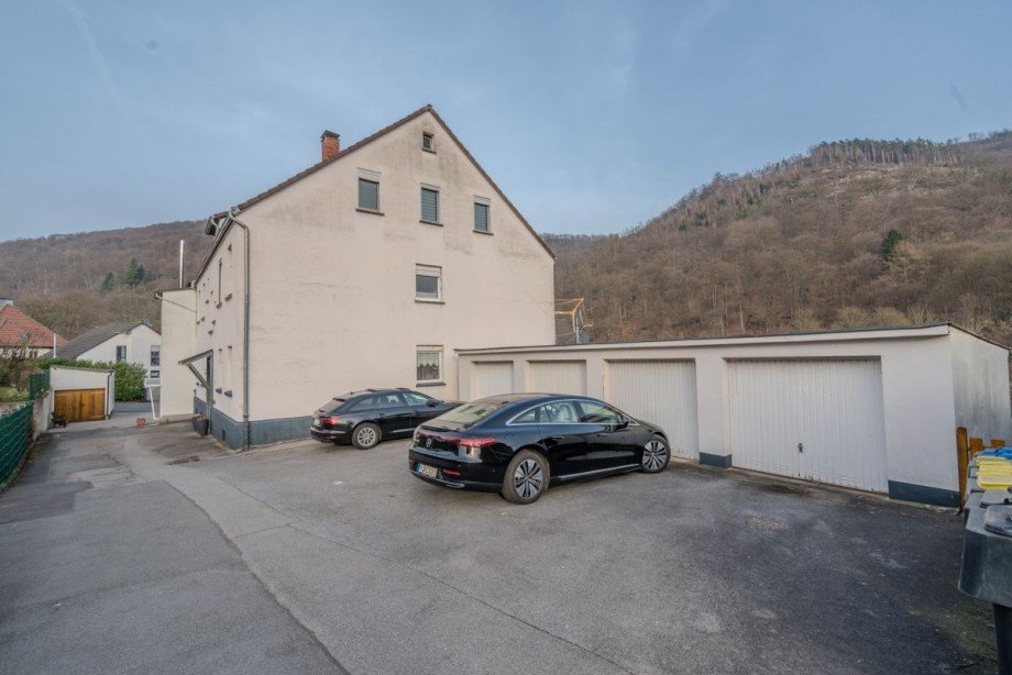 Ergänzt wird das Objekt durch vier Garagenboxen auf eigenem Hof, einen seitlichen Gartenbereich mit Rasenfläche, eine überdachte Terrasse sowie einen Balkon mit unverbautem Naturblick im ersten Obergeschoss. Im Keller befinden sich eine gemeinschaftliche Waschküche sowie abschließbare Kellerabteile für alle Einheiten. Die Kupfer- und Stahlleitungen wurden in Teilen bereits erneuert.